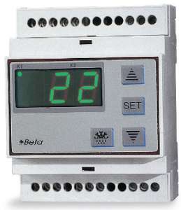 Plage –50/150°C. Résolution 1 ou 0,1°C (entre -9,9 & 99,9°C). Sondes NTC ou PTC. Deux relais 16 & 8A/250Vca. Alimentation 230Vca. Blocage du clavier. Boîtier 4 modules Rail DIN. |